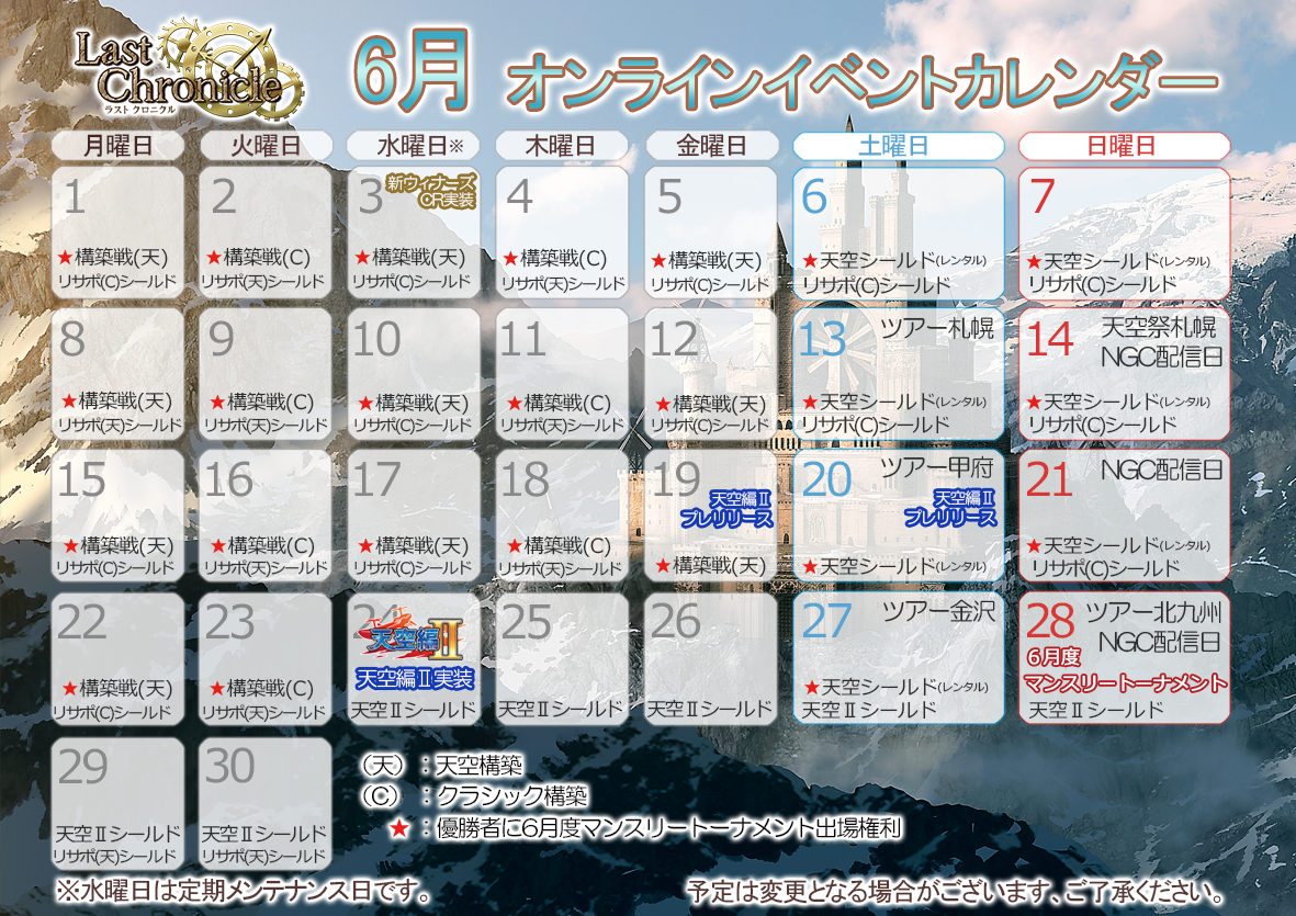 6月度マンスリートーナメントは6月28日に『天空構築』による構築トーナメントとして開催予定です。
