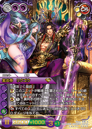 A.《紫炎帝 リクゴウ》です。自軍への吸収付与、のちパワーの低いブロッカーを一掃しての押し込み展開で活躍してくれました。