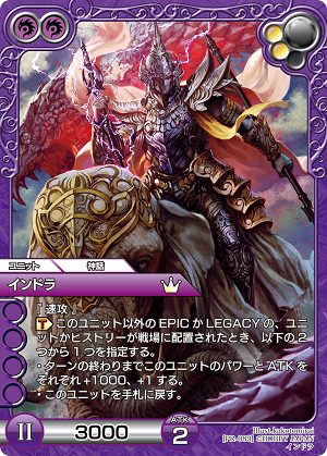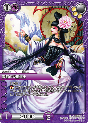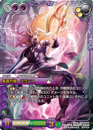 紫のSよ。ラウニスちゃんが防御されると相手のユニットに4000ダメージを与えられるわ。しかもブロックしたユニット以外にも与えられるから、実質ラウニスちゃんは防御できないようなものね。アクションアビリティはユニット1体に2000ダメージ。大悪党《小野小町》のような小さいユニットを倒すのも良し。他火力と合わせるのもよし。ただ【ケンタウロス】なのが注意よ。