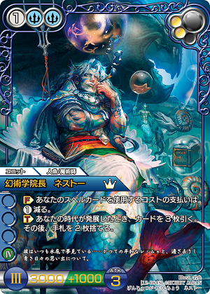 渋い。渋いわ。でもこんなに渋いのにかなりの女好きキャラらしいわ。効果はスペルカードの使用コストを①下げると、発展時に3枚引いて2枚捨てるコントロールデッキ向けのアドアドしい効果ね。陽光編IIでも新しいコントロールデッキが組めそうだし、クラシックでは《暗殺》も《魔血の刃》も効きづらいから安心して運用できそうね。スペルを使うたびに効果が起きる《アレン》くんとも相性が良さそうね。