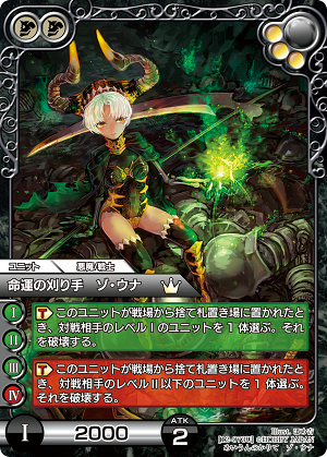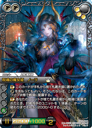 こちらも陽光編IIで追加された《呪魂の魔女姫 ノーラ》ちゃん。《堕魂術の大魔謀 アルゴー》の回収用として使われていた《堕魂の屍鬼剣士》との相性がとてもいいの。《堕魂の屍鬼剣士》の効果で-1000しつつ、復活したらノーラちゃんで-2000。毎ターンユニットを破壊できる強力コンボね。