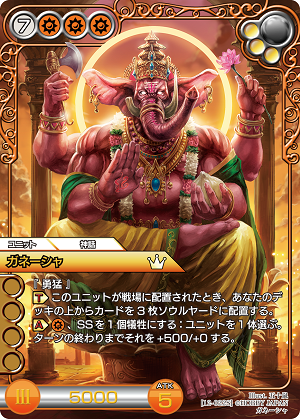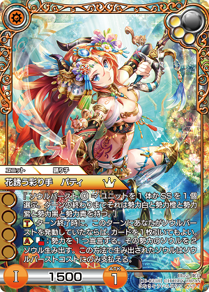 強力なソウルバーストと橙特有の大型ユニットで盤面を制圧するデッキね。各種SS増加カードで素早く大型ユニットの展開を狙うわ。 《花誘う彩り手 パティ》+《魂石山の蜂蜜盗み》、《豊穣の巫女》、 《勇気讃えし赤陽》、《異邦からの訪れ》+《ガネーシャ》と豊富なSS加速を搭載しているわね。