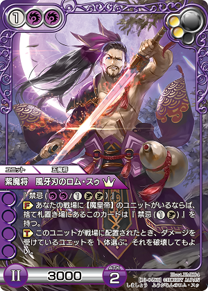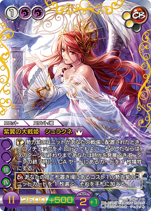 紫の苦手な大型ユニット《勇爪の戦姫 カリンナ》や《怒れるサイクロプス》をCBからの連携でポックリ倒せる優秀ユニット。パワーも3000と相手の攻撃を止めるには十分な数値ね。