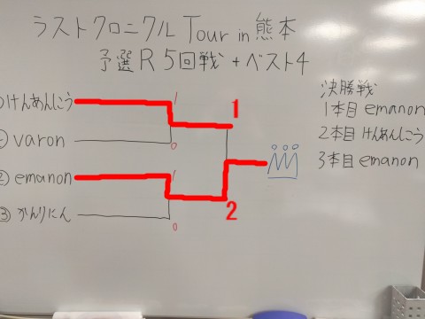 前日の鳥栖で予選決勝と8連勝したemanonさんが今回は2位通過、そのemanonさんの連勝を止めたかんりにんさんが3位通過、けんあんしこうさんとvaronさんも連日のトップ4進出となりました。そして優勝されたのは…