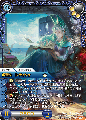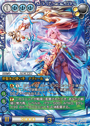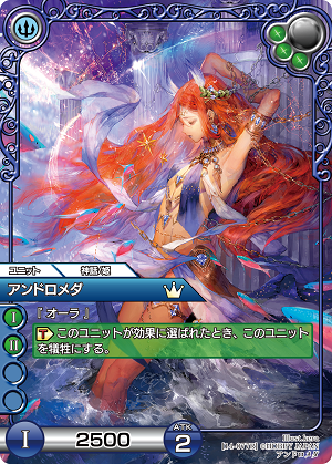 破格のスペックを持つ『オーラ』ユニット。青版《陽炎の精》といったところかしら。紫のCBには弱いけど《闇の接吻》や《水縄の束縛》の追加効果を無効化できたりと必ずしもデメリットではないのも良いとところね。